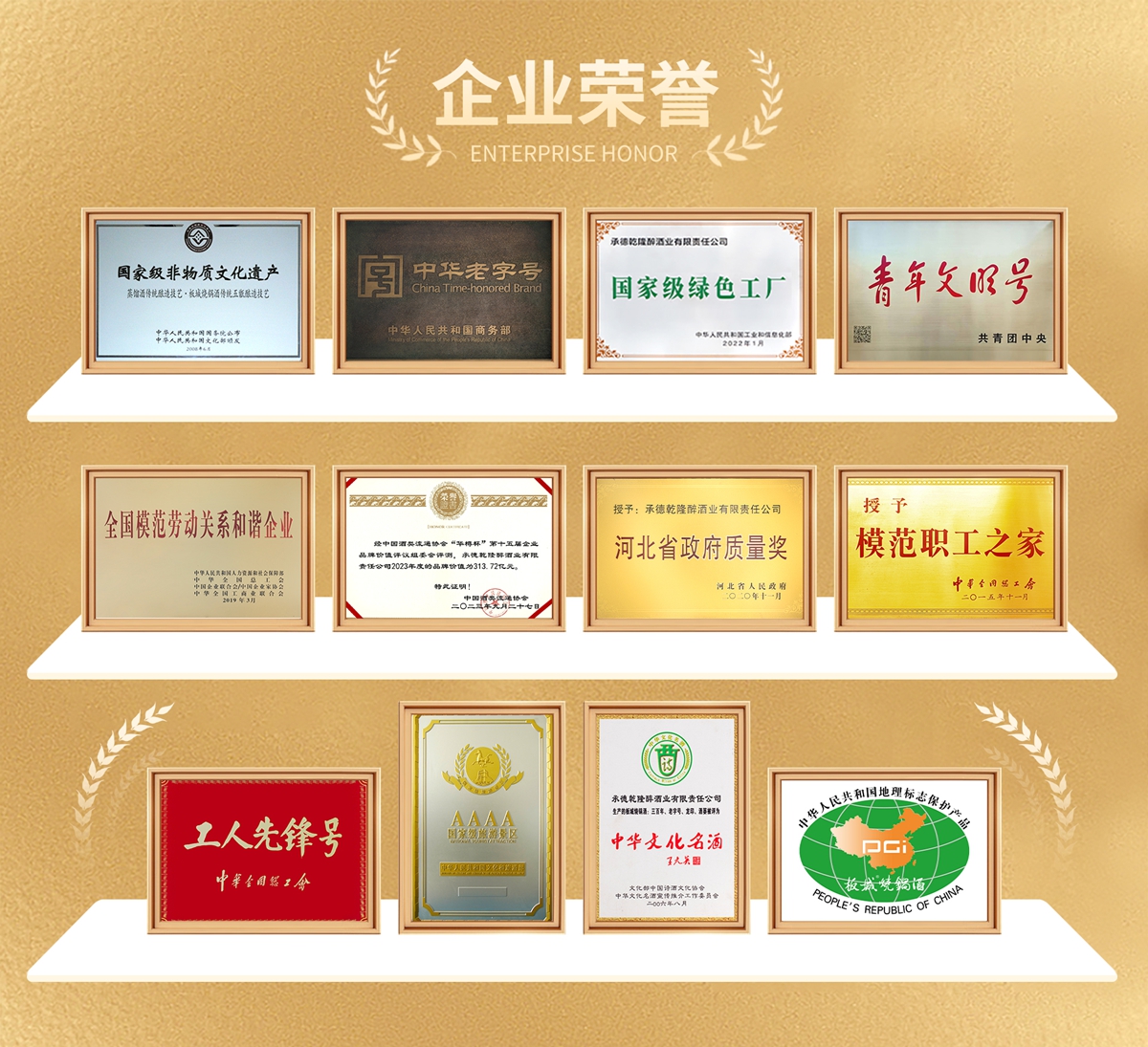 企業(yè)快速發(fā)展的同時(shí),也贏得了社會(huì)的廣泛贊譽(yù)。公司擁有國(guó)家專利8項(xiàng),注冊(cè)商標(biāo)124個(gè),先后榮獲“中華老字號(hào)”、“國(guó)家級(jí)非物質(zhì)文化遺產(chǎn)”、“國(guó)家地理標(biāo)志保護(hù)產(chǎn)品”、“國(guó)家級(jí)綠色工廠”、“中華文化名酒”、“全國(guó)模范職工之家”、“全國(guó)模范勞動(dòng)關(guān)系和諧企業(yè)”、“國(guó)家級(jí)青年文明號(hào)”、“全國(guó)工人先鋒號(hào)”“國(guó)家AAAA級(jí)景區(qū)”、“河北省政府質(zhì)量獎(jiǎng)”“第十五屆“華樽杯”板城品牌價(jià)值449.82億元”等上百項(xiàng)榮譽(yù)。