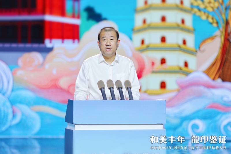 整場(chǎng)慶典以記錄承德人民美好生活、美景美食、農(nóng)業(yè)碩果的視頻《承德十二時(shí)辰》拉開(kāi)帷幕。承德市人民政府副市長(zhǎng)崔萬(wàn)峰率先上臺(tái)致辭,并對(duì)承德市2023年中國(guó)農(nóng)民豐收節(jié)暨龍印秋藏大典的召開(kāi)表示熱烈祝賀。