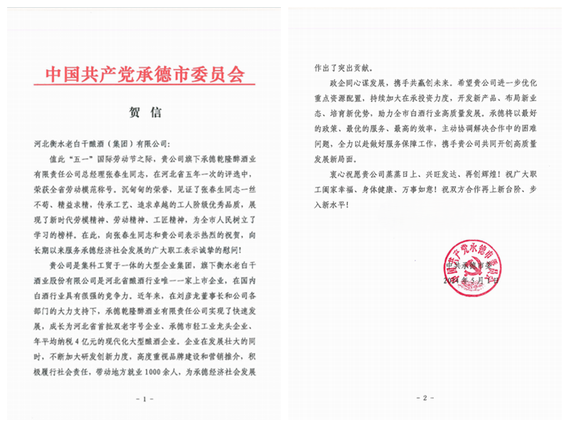 河北衡水老白干釀酒集團收到一封來自承德市委的賀信,賀信主要內(nèi)容是對河北衡水老白干釀酒集團子公司承德乾隆醉酒業(yè)(板城酒業(yè))黨委書記、總經(jīng)理張春生榮獲“全省勞動模范”稱號表示祝賀。祝賀信中講到:“張春生同志一絲不茍、精益求精,傳承工藝、追求卓越的工人階級優(yōu)秀品質(zhì),展現(xiàn)了新時代勞模精神、勞動精神、工匠精神,為全市人民樹立了榜樣,近年來,企業(yè)在發(fā)展壯大的同時,不斷加大研發(fā)創(chuàng)新力度,高度重視品牌建設(shè)和營銷推介,積極履行社會責(zé)任,帶動地方就業(yè)1000余人,為承德經(jīng)濟社會發(fā)展作出了突出貢獻。”張春生作為制造業(yè)(工業(yè)領(lǐng)域)的翹楚,先后獲省“三三三人才工程”人選、河北省企業(yè)家協(xié)會先進工作者、河北省食品行業(yè)年度人物、中國商業(yè)聯(lián)合會科學(xué)技術(shù)獎、全國商業(yè)科技進步獎-特等獎、2020年與2022年度分別榮獲河北省優(yōu)秀民營企業(yè)家等多項榮譽。