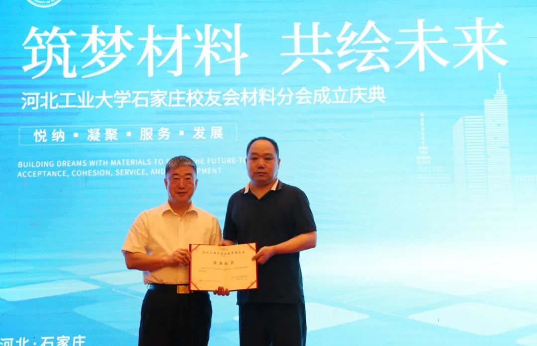 河工大石家莊校友會韓杏軍會長為材料分會會長唐永忠頒發(fā)備案證書