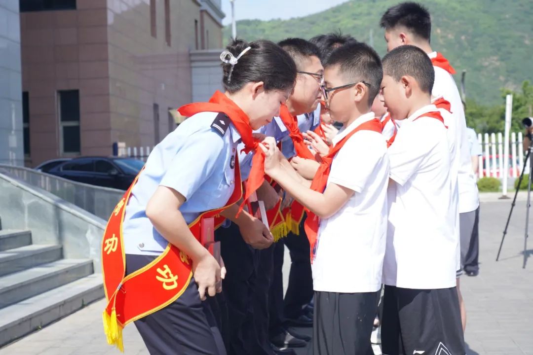 在開營儀式上,河北省公安廳黨委委員、政治部主任齊建政向承德市公安機關立功受獎民警代表頒獎。夏令營的公安英烈子女代表為獲獎民警敬戴紅領巾。這一刻,孩子們仰慕的眼神讓獲獎民警心情難以平靜,他們把孩子們摟在懷里,真情祝福他們健康成長。公安英烈子女代表黃昶瑋代表夏令營的孩子們發言,他說,我們會牢記各位英模、公安前輩的囑托,繼承和發揚父輩的忠誠本色和優良作風,樹立戰勝困難的信心和勇氣,沿著父輩的足跡堅定前行,早日成為建設國家、服務人民的棟梁之才。