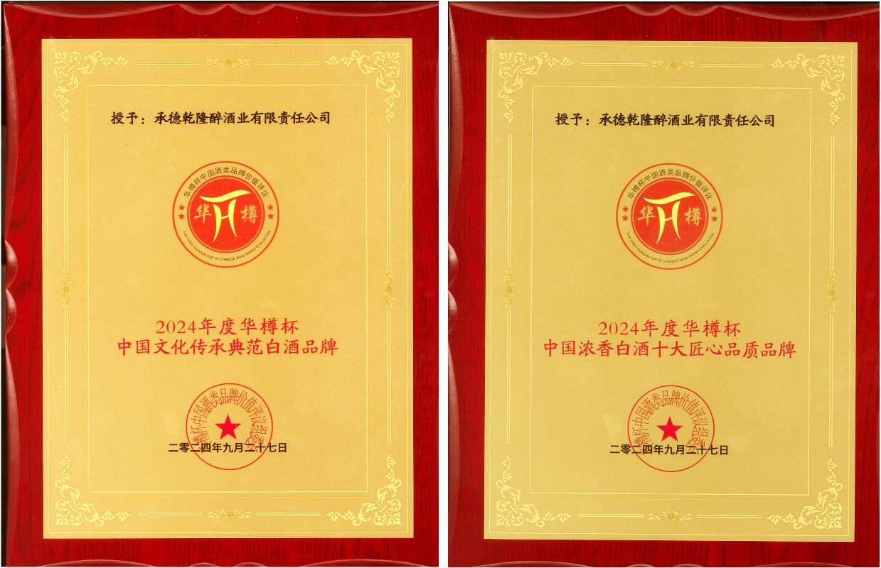 板城酒業憑借過硬的綜合實力得到行業肯定及評審專家的認可,經中國酒類流通協會“華樽杯”第十六屆中國酒類品牌價值評議組委會評測,承德乾隆醉酒業有限責任公司(板城酒業)2024年度的品牌價值為449.82億元,中國白酒行業排名三十位,同時,榮獲“2024年度華樽杯中國濃香白酒十大匠心品質品牌”、“2024年度華樽杯中國文化傳承典范白酒品牌”獎項,充分彰顯了冀酒的品質自信,也傳遞出行業、社會對板城酒業品牌文化的高度認可。