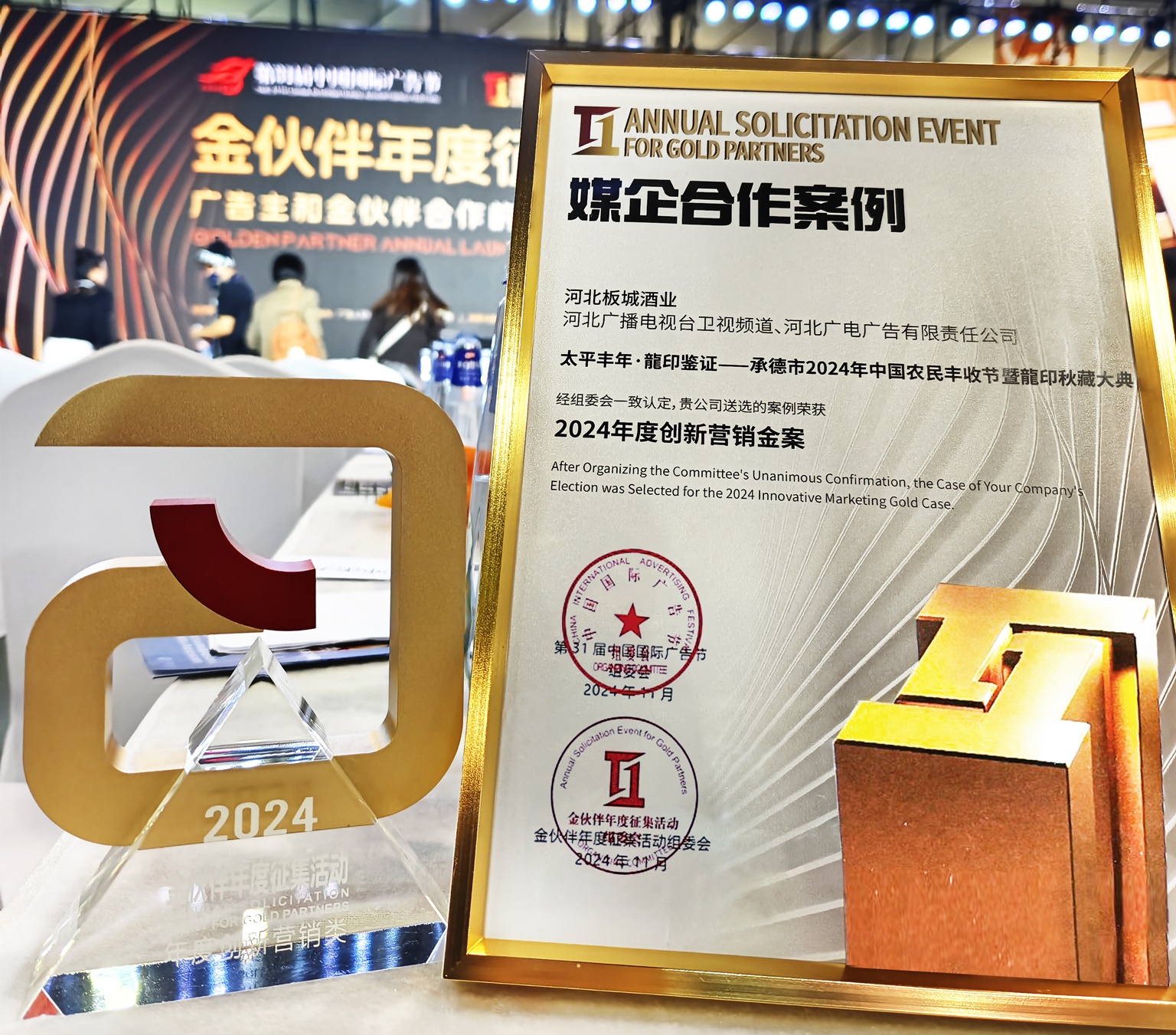 板城酒業與河北衛視頻道合作案例【河北衛視聯合廣電廣告助力板城酒業農民豐收節暨龍印秋藏大典】入選31屆中國國際廣告節·2024廣告主金伙伴年度征集發布儀式·媒企合作案例·年度創新營銷金案。