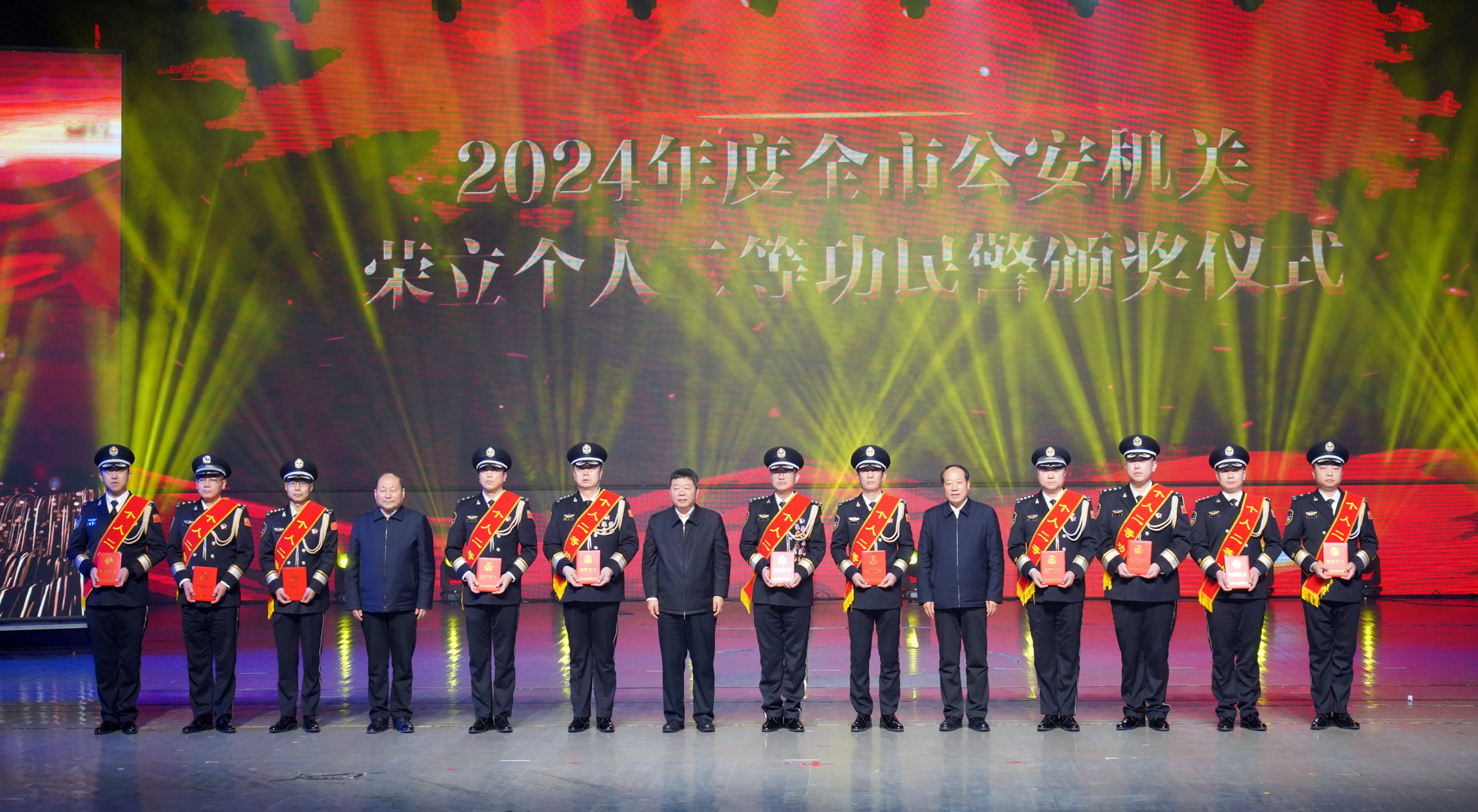 市委副書記、市長王亞軍,市人大常委會主任劉文勤,市政協主席吳清海,為榮立個人二等功民警頒獎