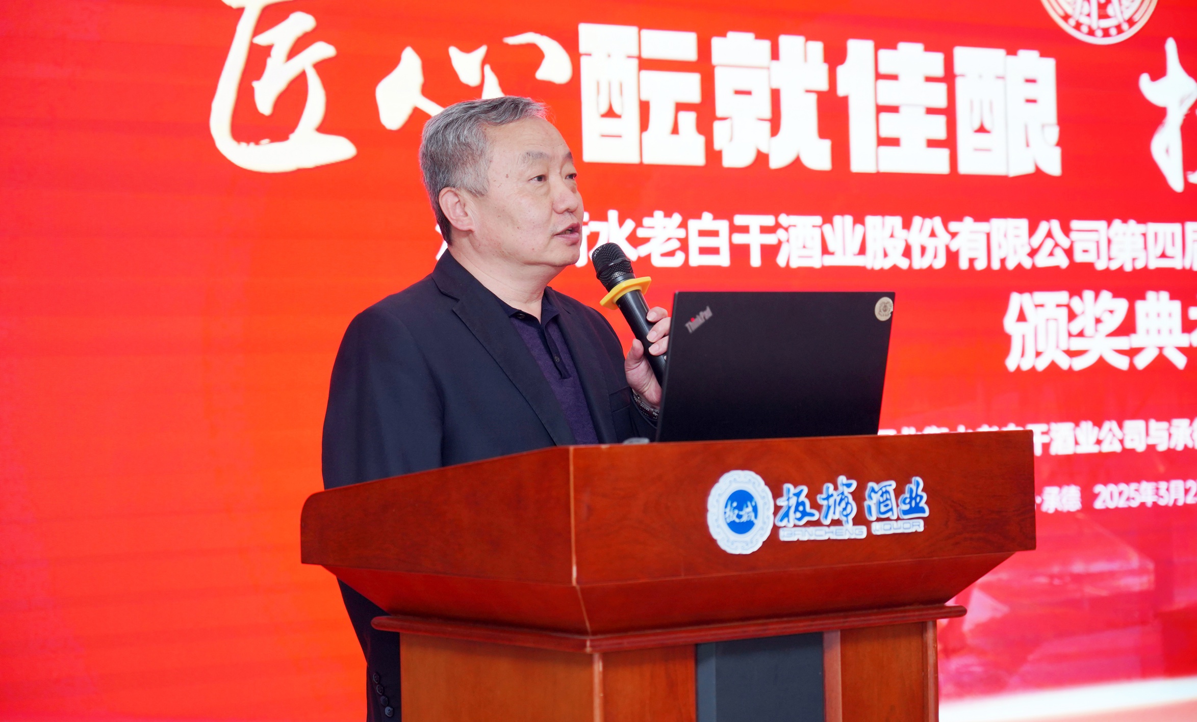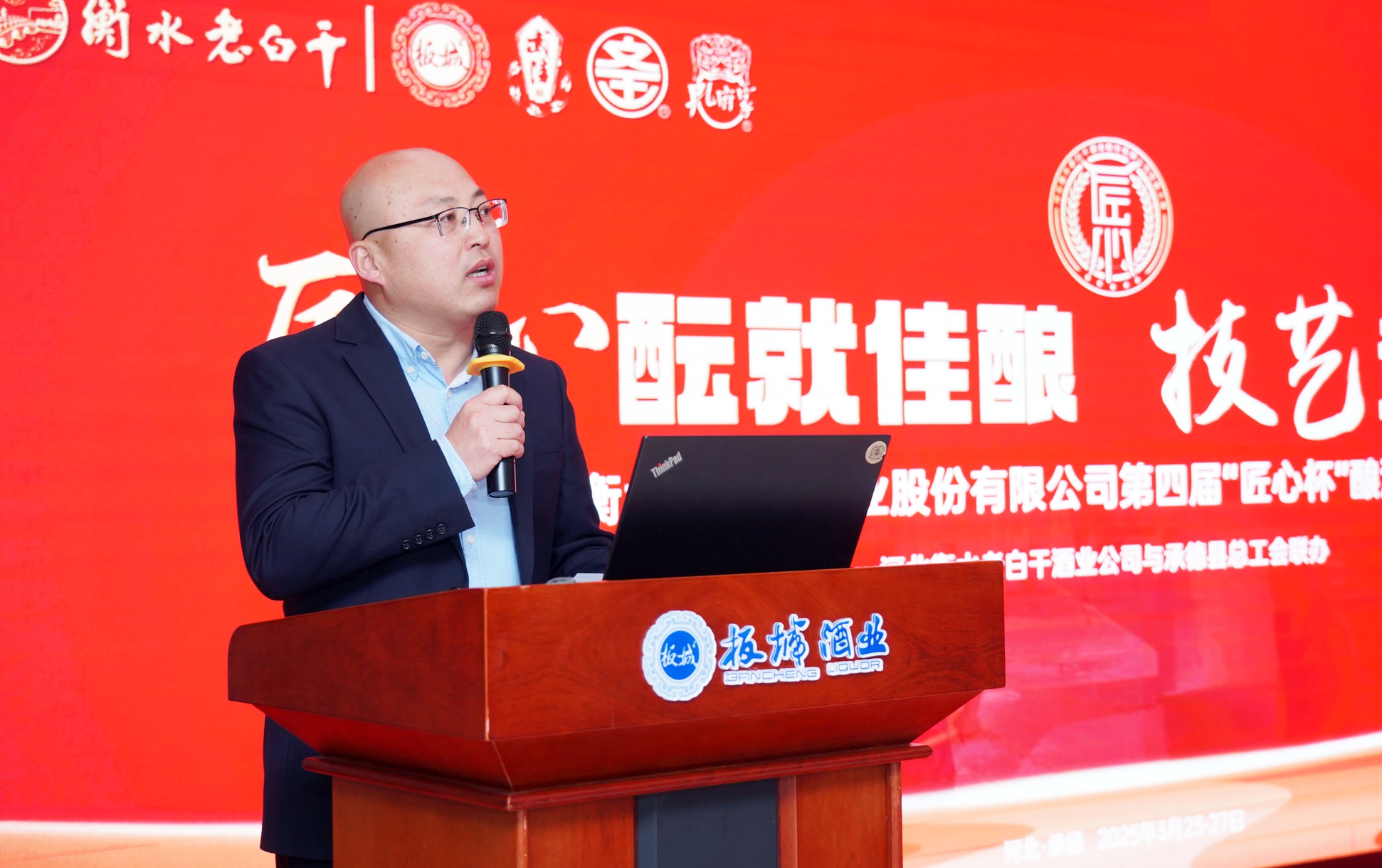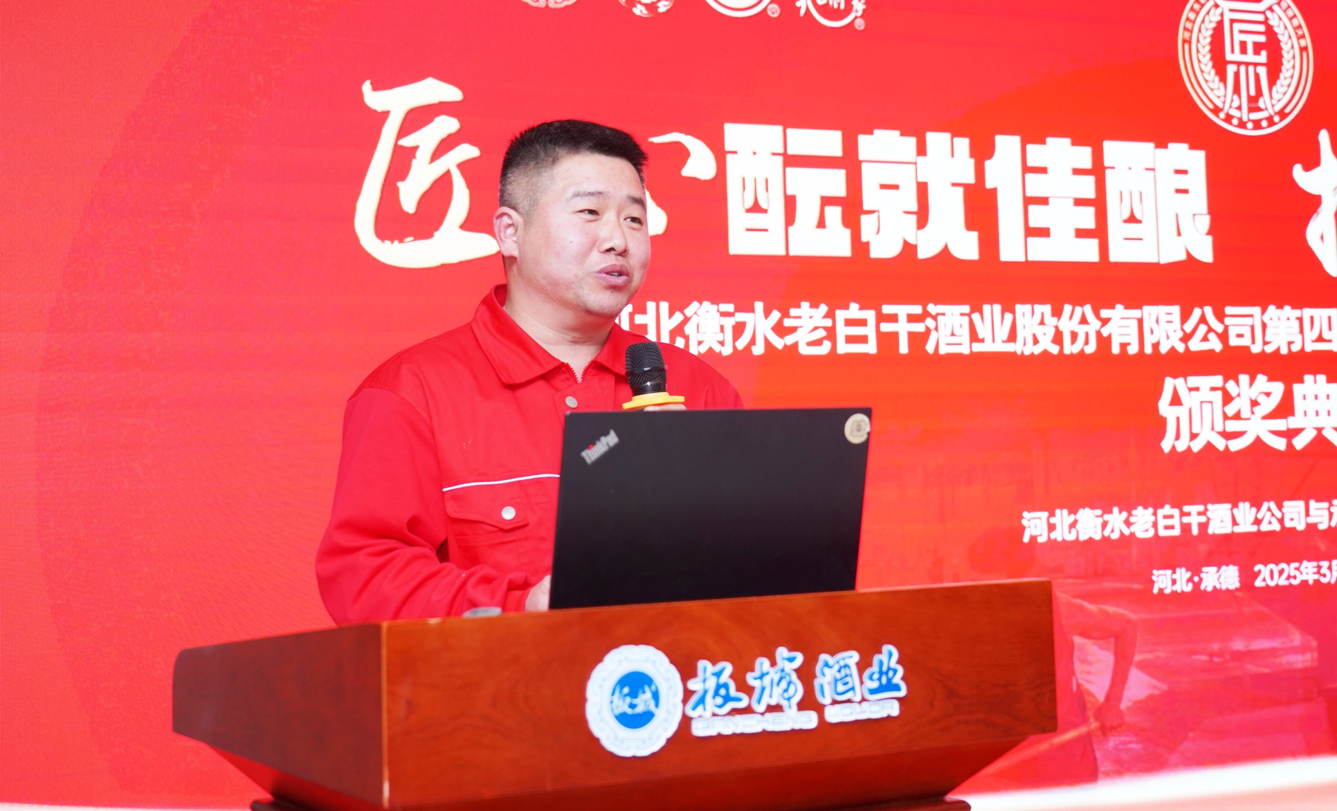 閉幕式中,由衡水老白干酒業公司技術中心副主任王新磊針對本屆“匠心杯”大賽的開展情況進行總結匯報。一是組織籌備,科學規范、保障有力;大賽提前謀劃、起草比賽規則,實時溝通,精心布置,確保賽事高效運轉。二是賽程設計注重實效,大賽比賽項目包含理論考試、評酒能力、釀酒實操技能三個部分,期間穿插進行了釀酒生產工藝管控及質量提升專題講座和小改小革分享。在大賽中及時發現比賽規則評判標準與實際操作上的不足并及時進行修正,有序保障比賽活動的有序、嚴謹進行。