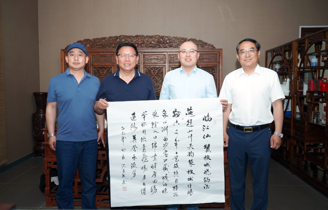 訪問期間,沈重武副會長現場揮毫潑墨,向板城酒業贈送書畫作品《臨江仙·贊板城燒鍋酒》,表達了其對板城酒業三百多年不間斷傳承的國家級非物質文化遺產老五甑釀造技藝與“一店燒鍋兩朝御賜,乾隆妙對嘉慶天章”深厚歷史的稱贊。