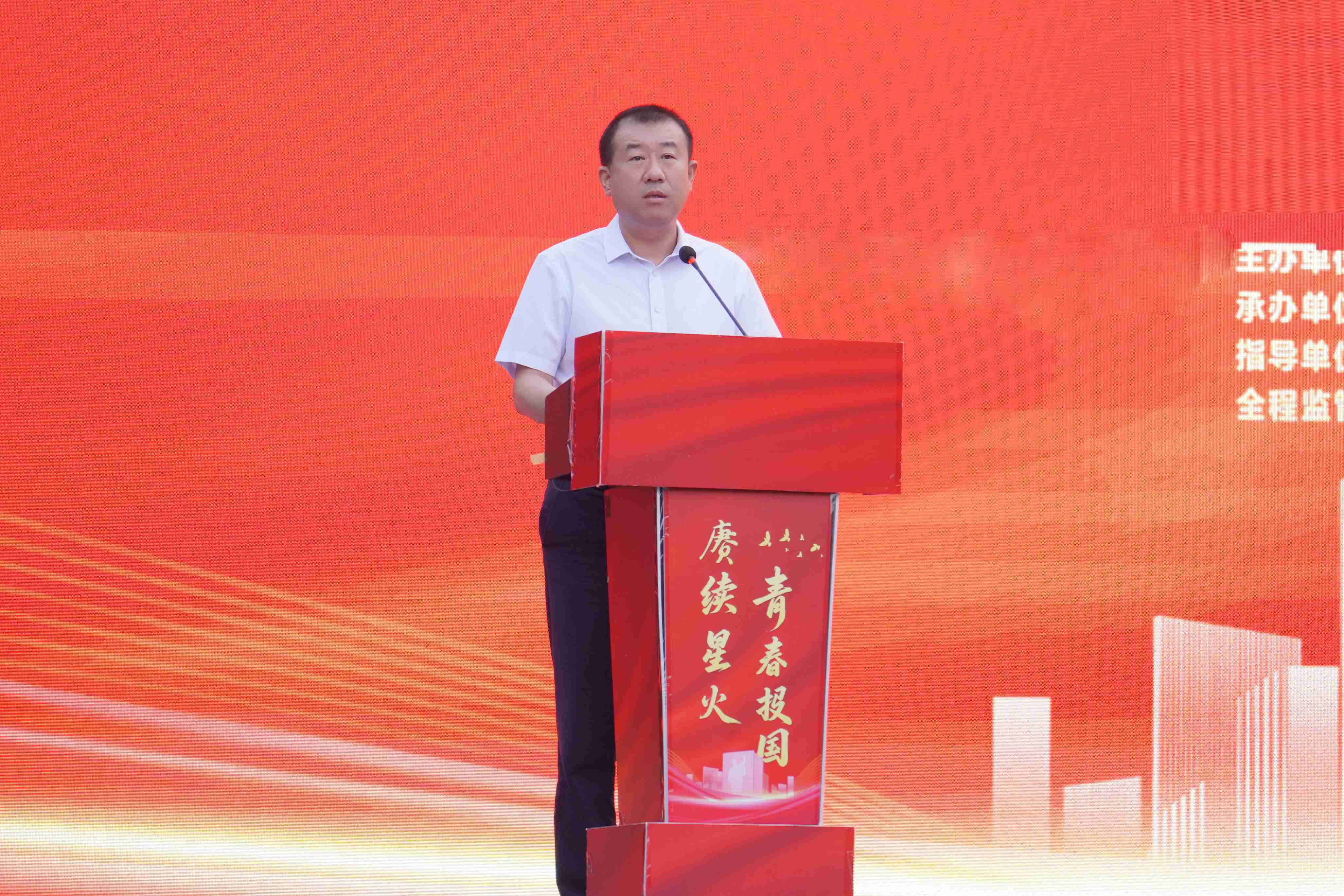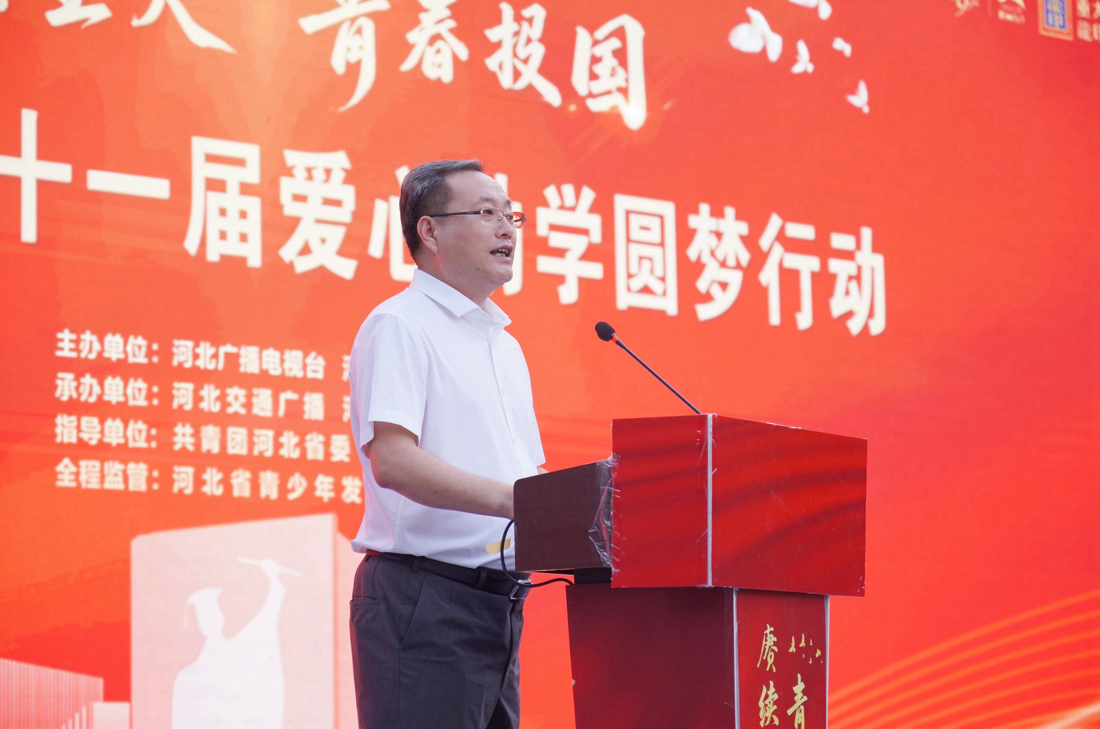 河北廣播電視臺副總編輯邊宇峰致辭,邊宇峰講到:“作為主流媒體、責任擔當,河北廣播電視臺始終與時代同行,與人民同向。值此抗戰勝利八十周年,我們賦予本屆活動深沉的主題——‘賡續星火青春報國’這不僅是一次助學行動,更旨在為學子注入時代精神與國際視野,將個人理想熔鑄于民族復興的壯闊征程。讓我們攜手并肩,讓助學‘星火’代代相傳,照亮青春夢想,共繪時代華章!”