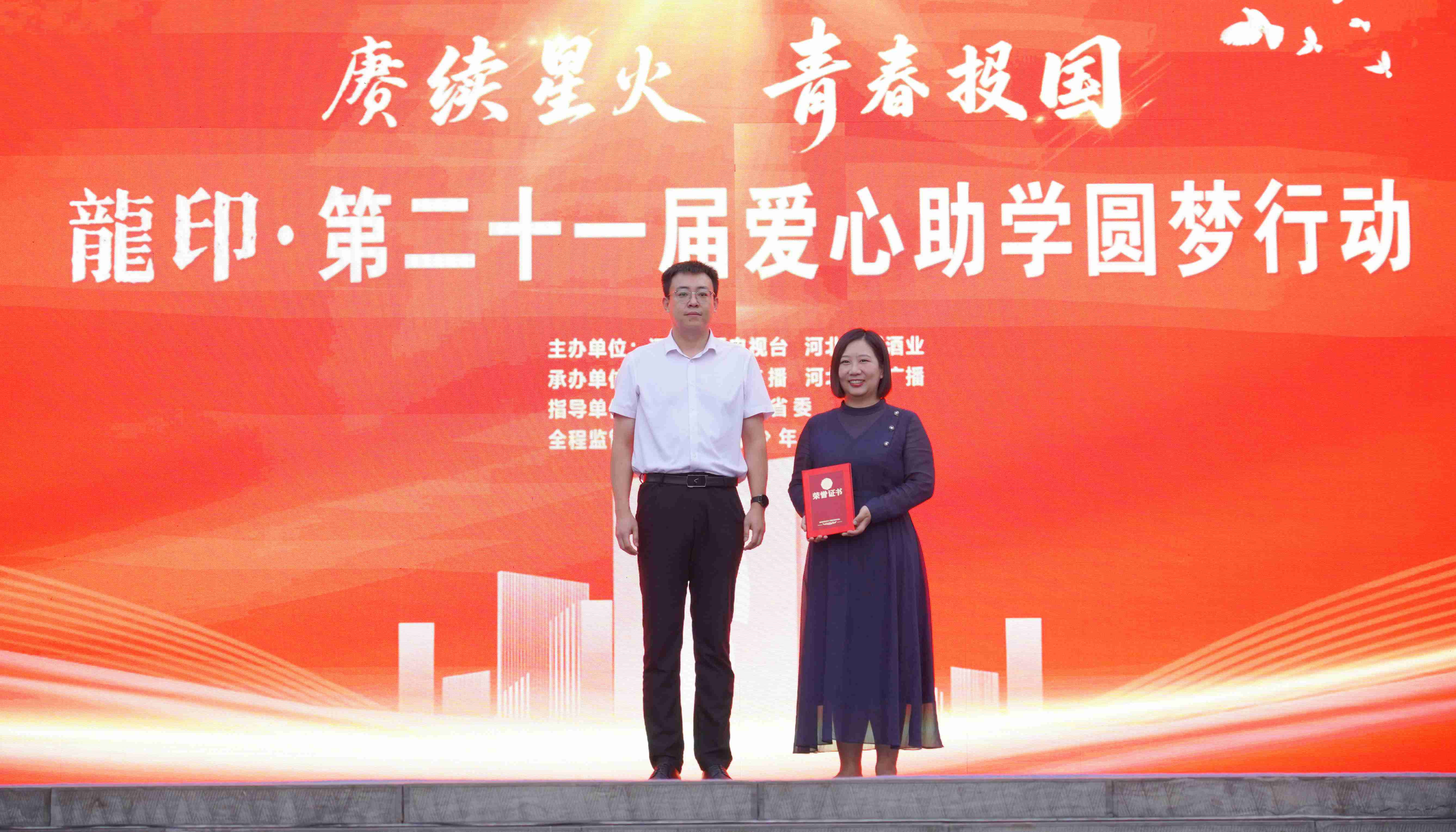 河北廣播電視臺副總編輯邊宇峰、板城酒業銷售市場總監王曉波登臺為學子頒發助學金。